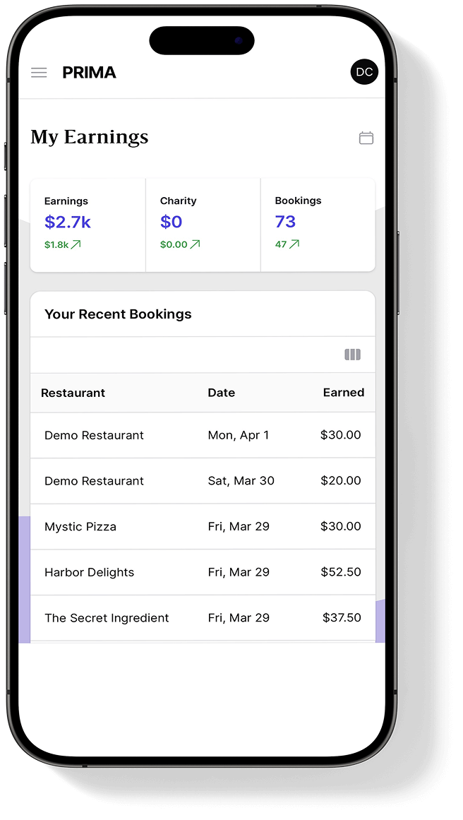 PRIMA convierte las reservas en una fuente directa de ingresos, con un panel transparente y fácil de usar que muestra en tiempo real cuánto estás generando.
